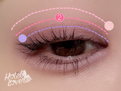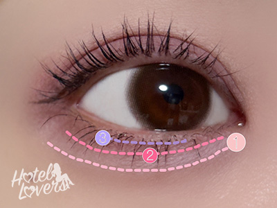 下まぶた全体に❶をのせて、キワに❷を引くように重ねます。