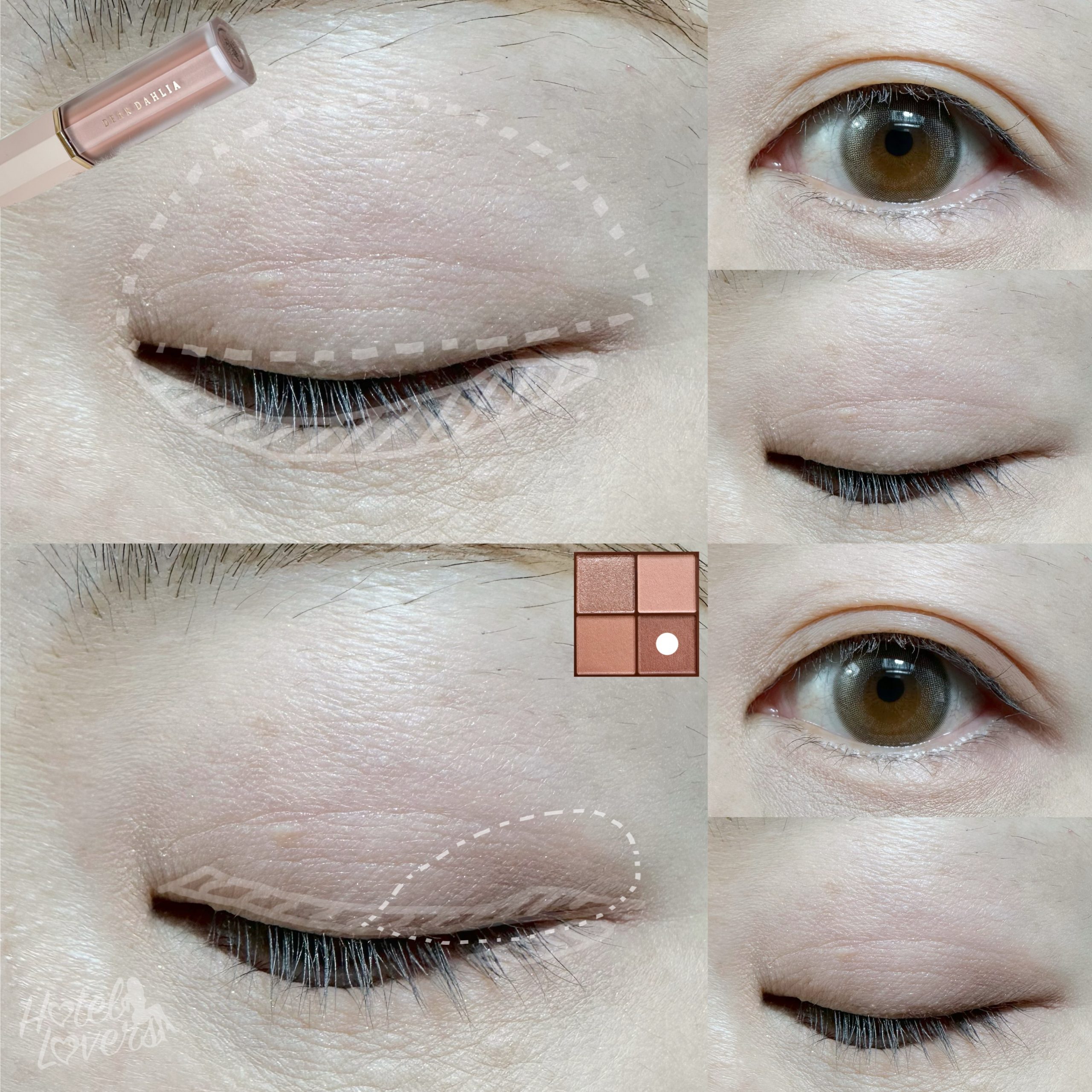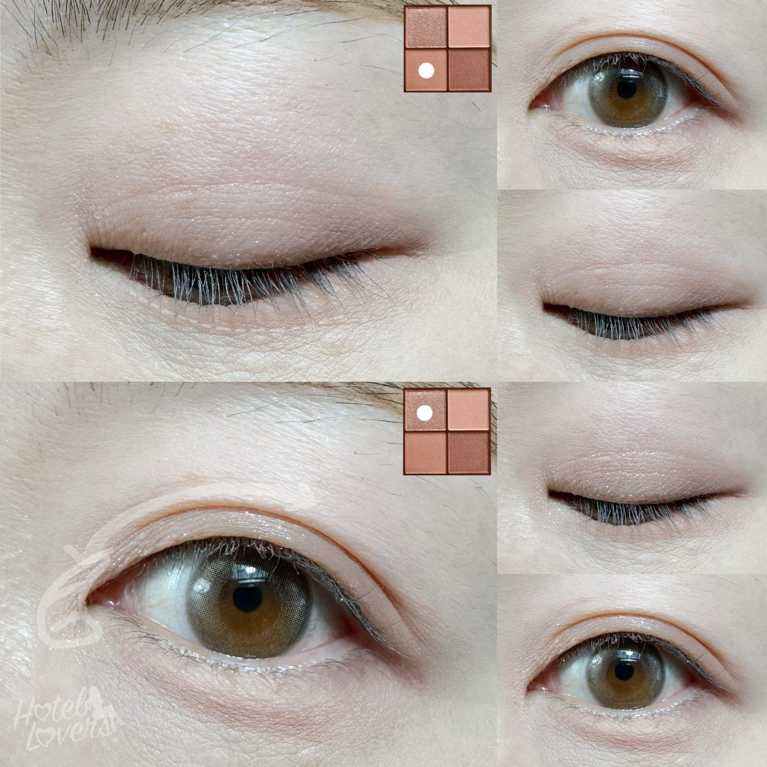 次に、アイシャドウパレット右下の締め色ブラウンカラーを目のキワと目尻に塗っていきます。