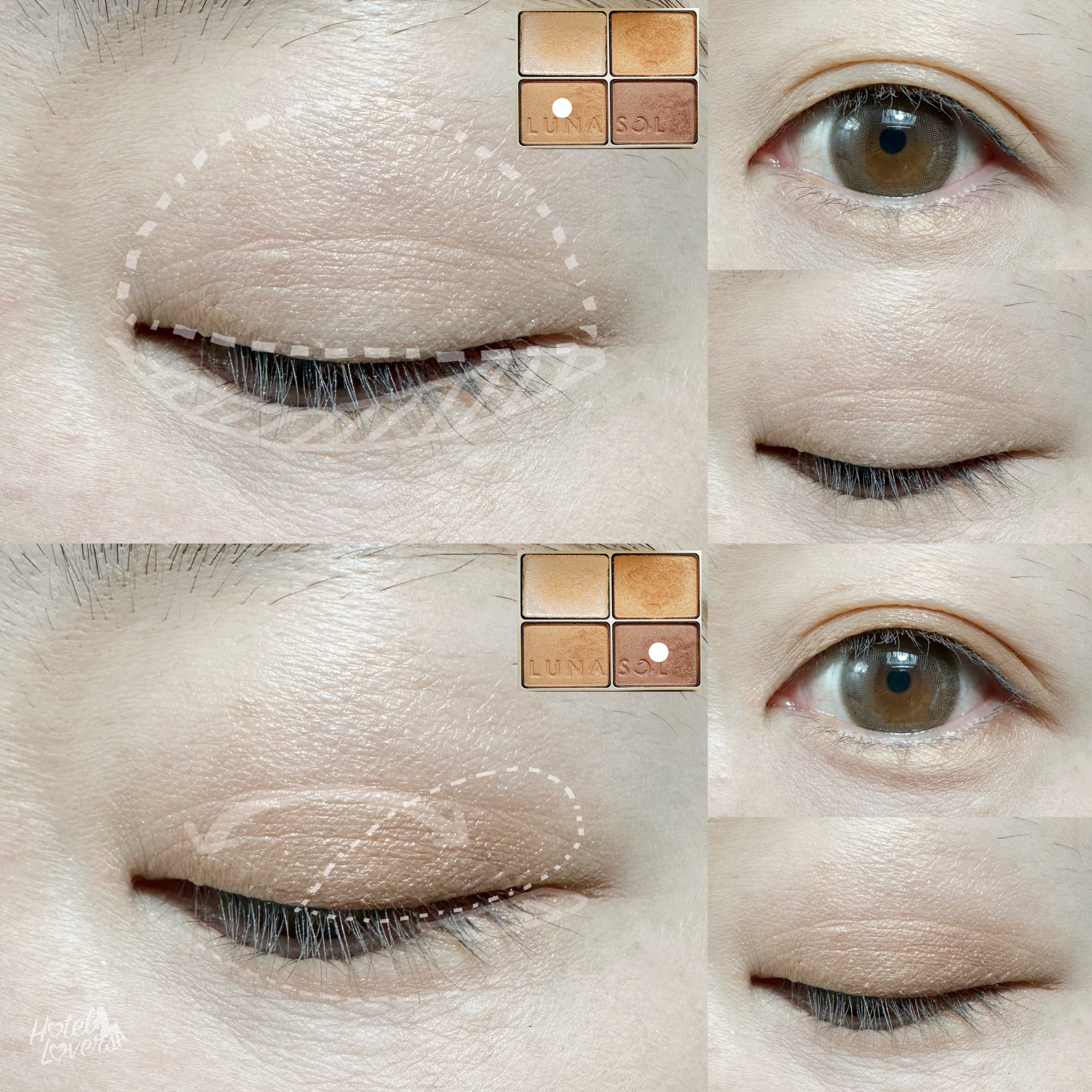 左上のアイボリーラメカラーをまぶたにピンポイントに使います。